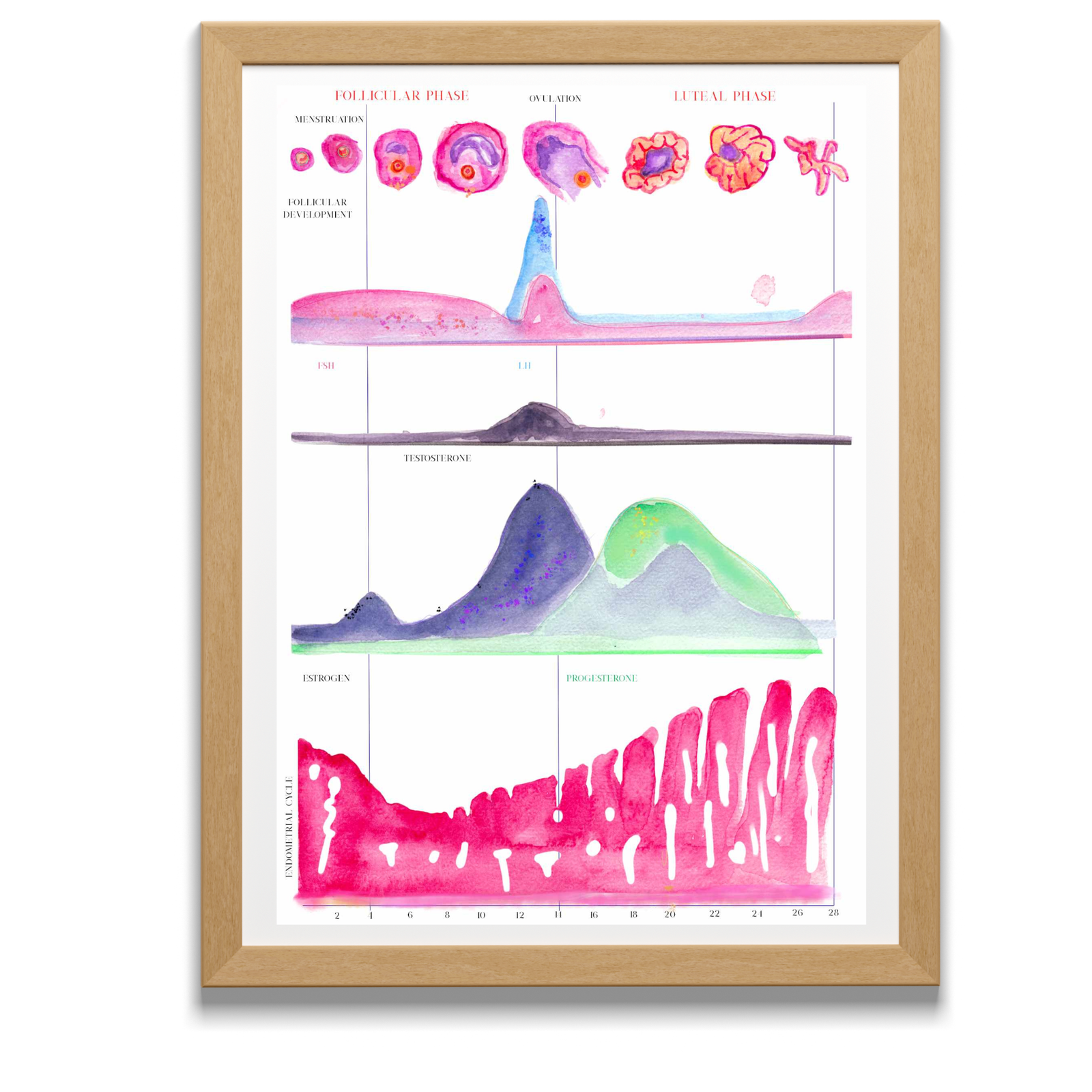 This is a print of a watercolor painting of the estradiol molecule, which would make an elegant, interesting, and colorful OBGYN office wall decor. The carbon contains flower illustrations in different patterns, in an effort to convey elegance and femininity.