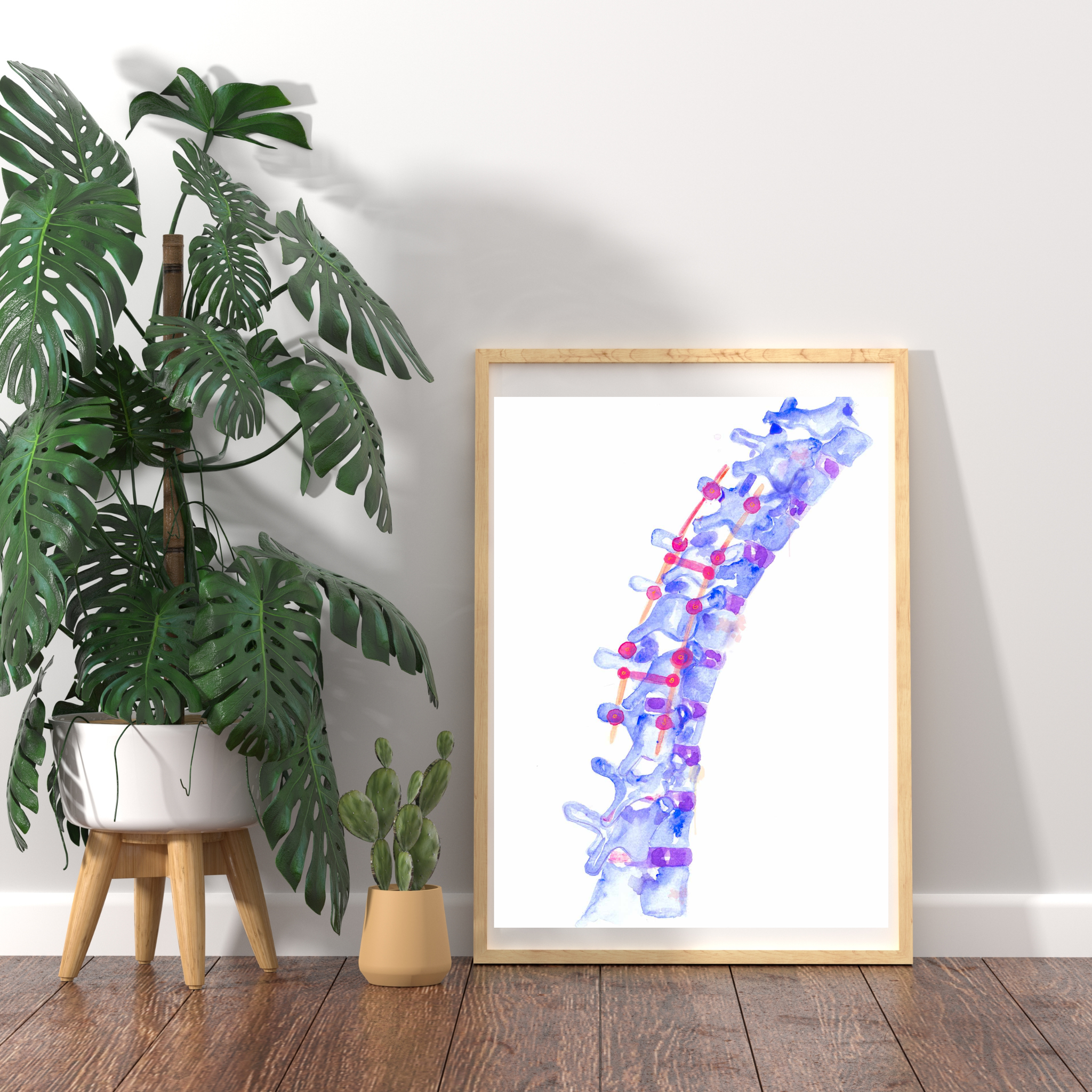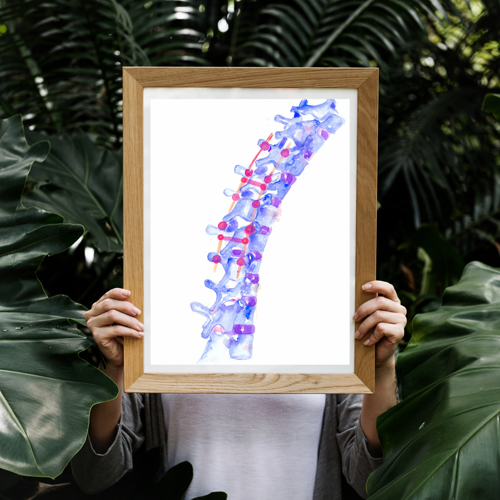 This is a print of my watercolor spine surgery art print, illustrating the rods and screws in back surgeries to hold vertebrae in place while they heal and fuse.