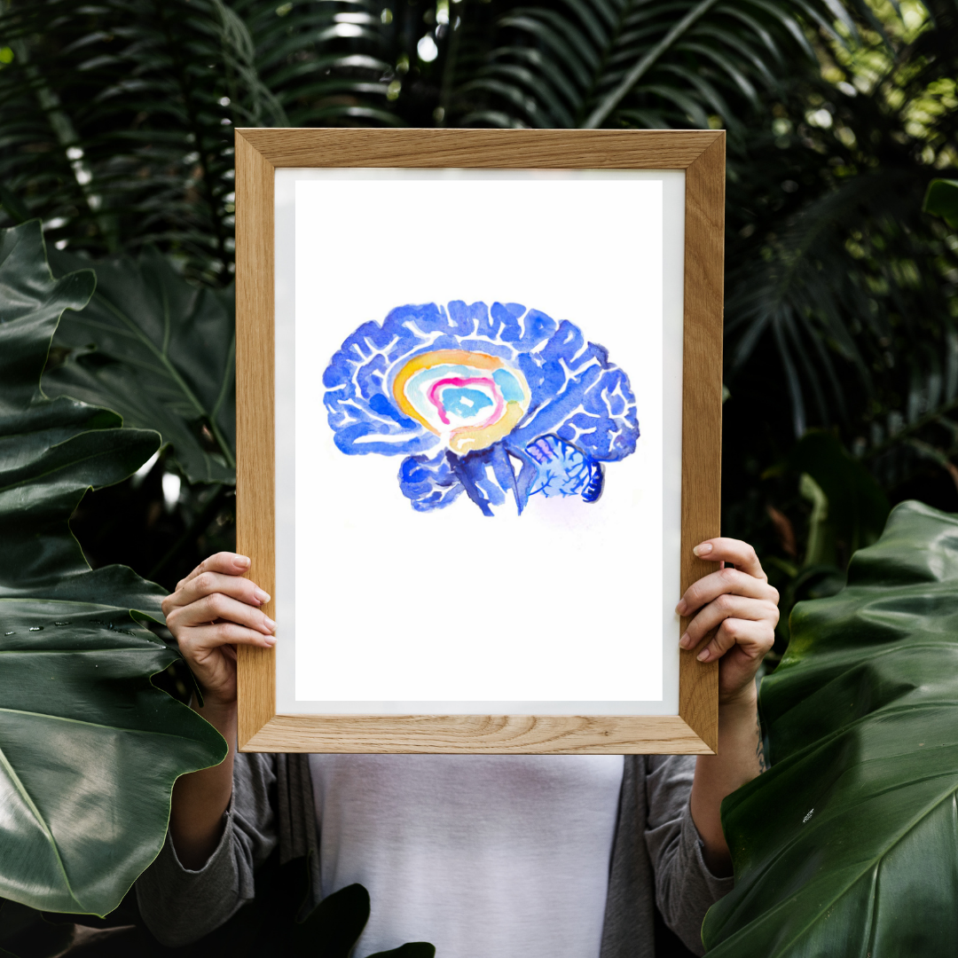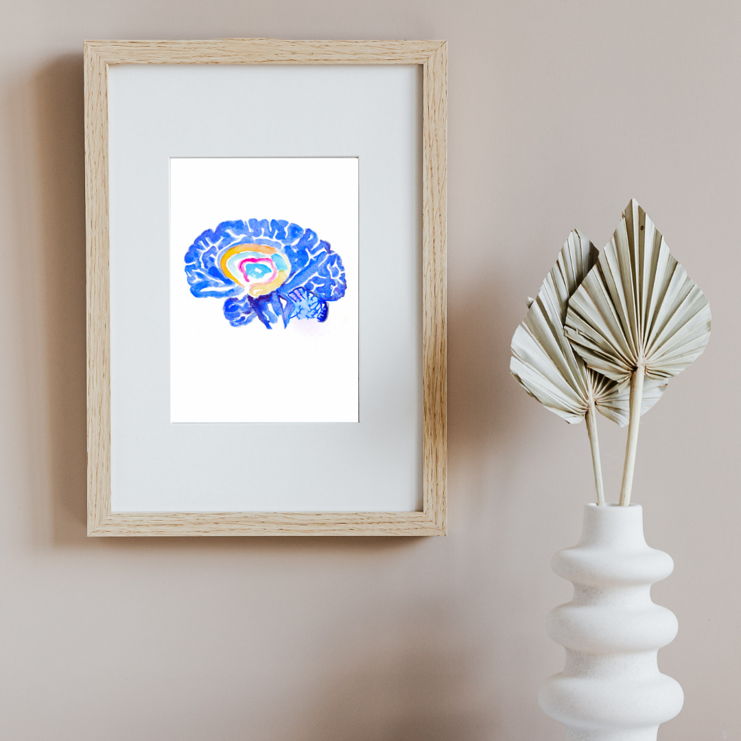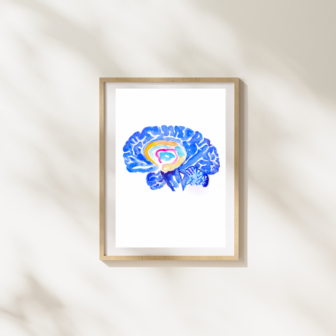 This is a print of my watercolor brain anatomy painting, illustrating the hippocampus.