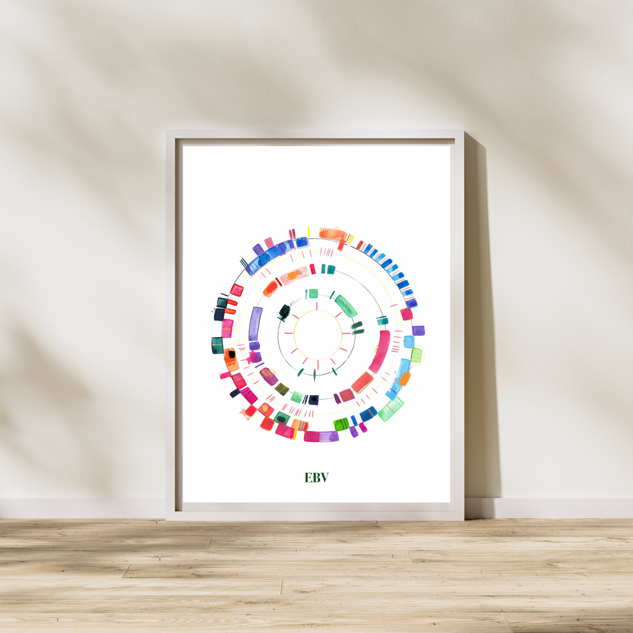 This print is based on my watercolor painting of the EBV virus genome. An abstract microbiology art print that will look amazing in laboratories and make a beautiful gift for scientists.