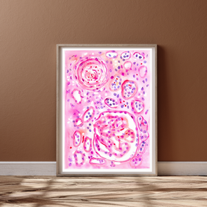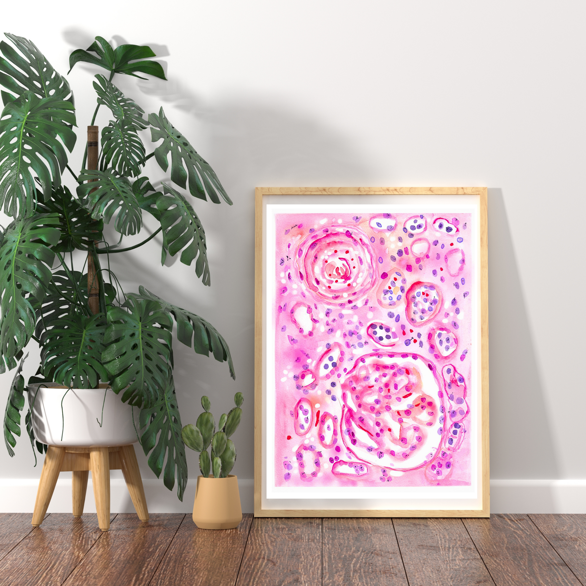 This is a print of my watercolor painting of malignant nephrosclerosis. It shows thrombotic microangiopathy with fibrinoid necrosis.